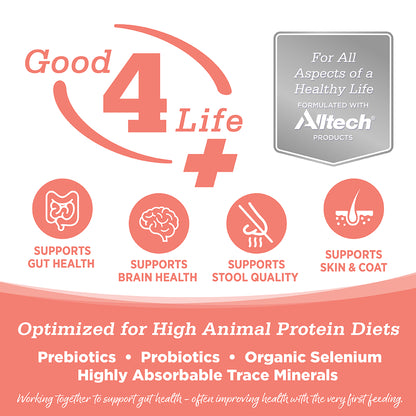Complementado con NGVEN diseñado para optimizar el microbioma necesario para la utilización completa de una dieta rica en proteínas animales.