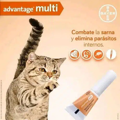 El anti pulgas Advantage Multi Gato de Bayer provee a tu gato una protección de amplio espectro contra los parásitos tan molestos. Con Advantage Multi puedes estar tranquilo de que tu gato se mantendrá libre de pulgas, gusano de corazón y parásitos intestinales.